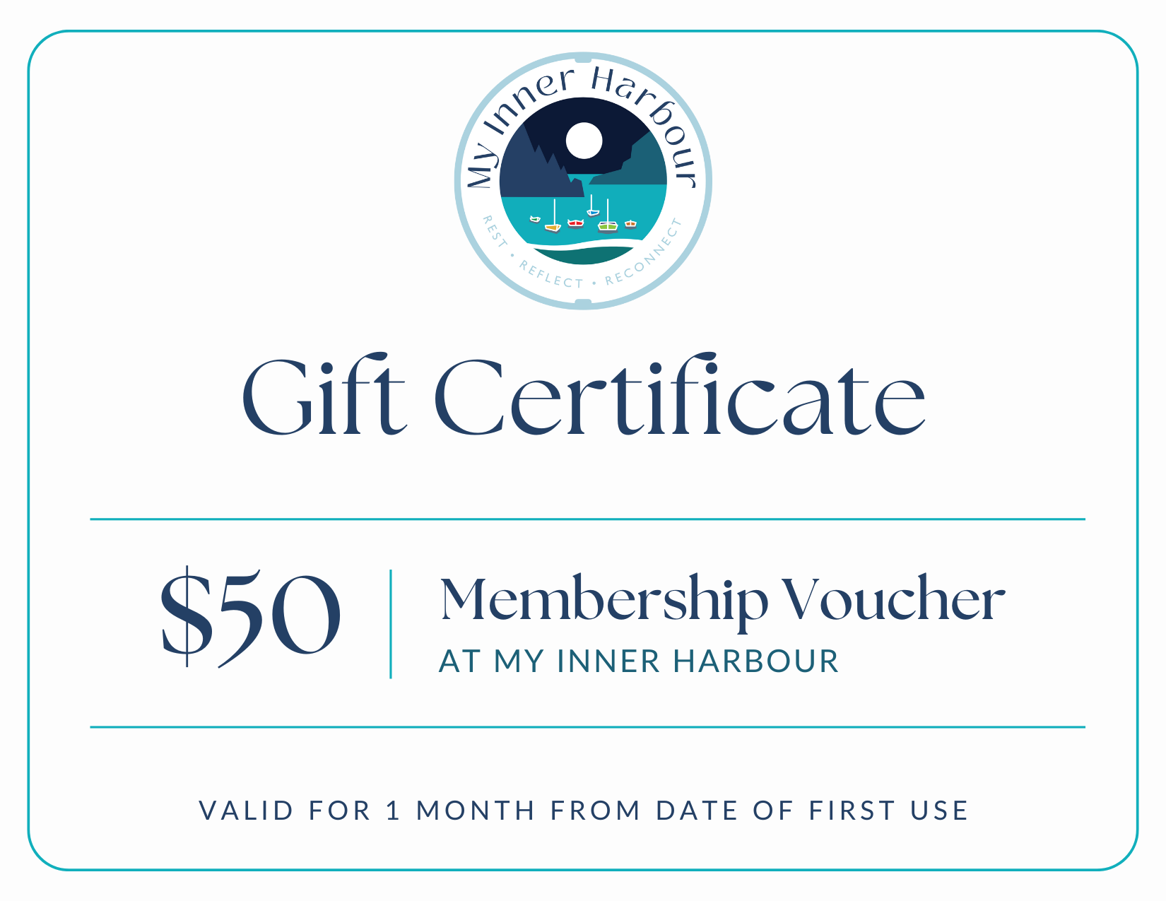 A gift certificate for a 30 day self-care membership to access wellness practices at My Inner Harbour, valid for 1 month from the date of first use.